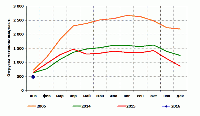 /НП НСРО «РУСЛОМ.КОМ», Алексей Чижиков/ В январе 2016 г. отгрузка лома черных металлов железнодорожным транспортом во внутригосударственном и экспортном сообщении оценивается в 473,6 тыс. т, что на 25,9% (-165,5 тыс. т) меньше отгрузки января 2015 года и на 34,2% (-245,6 тыс. т) меньше отгрузки января 2006 г.