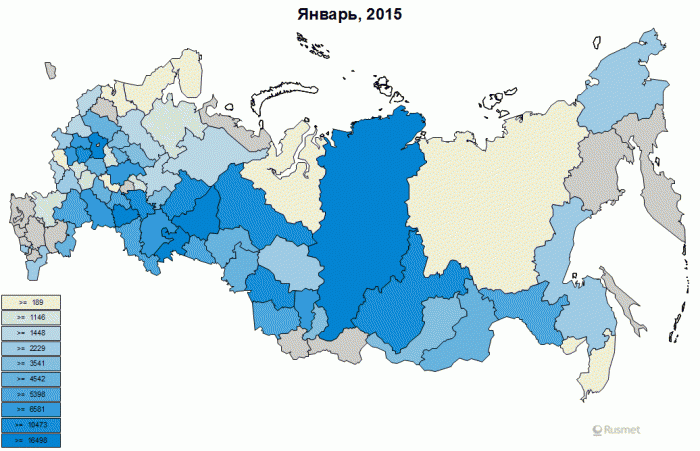 Географическое распределение интенсивности отгрузки лома черных металловв январе 2015 г.