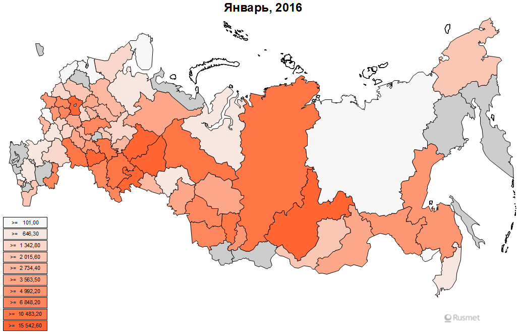 Географическое распределение интенсивности отгрузки лома черных металлов в январе 2016 г.