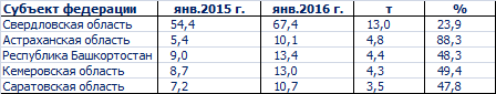 Области с максимальным увеличением отгрузки в январе 2016 г., тыс. т