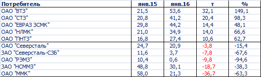 Наиболее существенно (-63,3% к январю 2015 года; -36,7 тыс. т) в январе снизились железнодорожные поставки лома на ОАО «ММК» и составили лишь 21,3 тыс. т.