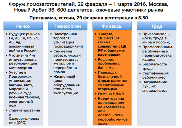 Участников рынка лома банки настолько достали с их «внимательным» отношением к металлоломным компаниям, что крупные игроки готовы скинуться, чтобы сделать свой банк. Этот вопрос будет обсуждаться на форуме «Лом черных и цветных металлов» 29 февраля – 1 марта 2016 года в Москве.