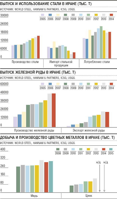 В презентации британской Hannam & Partners говорится, что запасы меди в стране составляют 30 млн тонн (ресурсы — 2,5 млрд тонн), цинка — 200 млн тонн (ресурсы — 10 млрд тонн), железной руды — 4,6 млрд тонн (ресурсы — 20 млрд тонн; геологическая служба США USGS оценивает запасы железной руды Ирана скромнее — в 2,7 млрд тонн по итогам 2015 года). По данным USGS и International Copper Study Group, добыча железной руды в Иране в 2015 году составила 33 млн тонн, меди — около 300 тыс. тонн. Актуальных данных по добыче цинка нет, в 2013 году выпуск металла в Иране составил свыше 130 тыс. тонн при мощности заводов страны в 450 тыс. тонн в год.