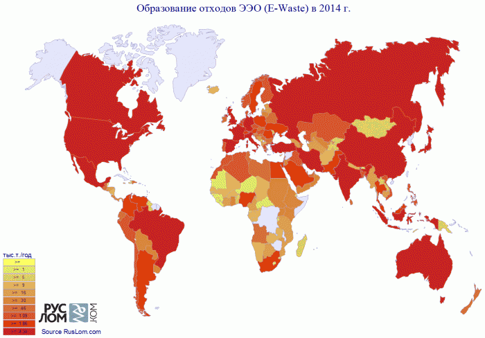Экспертами этой организации произведен расчет, что по итогам 2014 г. во всем мире был образовано 41,8 млн.т. отходов электротехнического и электронного оборудования. При этом ожидается, что к 2018 г. объем ОЭЭО вырастет на 8,0 млн.т. или 19,1 % и достигнет 49,8 млн.т.