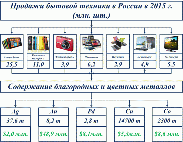 При этом реализация населению всевозможной электронной техники, является одним из «островков стабильности» отечественной экономики. Несмотря на некоторое снижение продаж гаджетов к прошлому году, в России в 2015 г. было продано 25,5 млн. смартфонов, 11 млн. кнопочных телефонов, 6,2 млн. планшетов и т.п. Стоимость цветных и драгоценных металлов в них оценивается на уровне 73 млн. долл. Остается только вопрос, когда и где организовать сбор этих устройств для вторичной переработки.