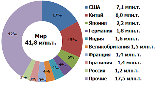 Крупнейшими странами по образованию ОЭЭО в 2014 г. стали США (7,1 млн.т.), Китай (6,0 млн.т.) и Япония (2,2 млн.т.). Россия с объемом образования ОЭЭО на уровне 1,2 млн.т. в год находится на 9 месте.