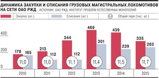 В ОАО РЖД (владеет 20,9 тыс. локомотивов) отметили, что с основания компании в 2003 году закуплено более 5 тыс. локомотивов, средний износ за последние десять лет снизился с 82% до 69%. О том, сколько локомотивов ОАО РЖД придется списать, там не сообщили. В 2014 году монополия купила 660 локомотивов на 76,5 млрд руб., на 2015 год было предусмотрено выделение 60,2 млрд руб. на закупку 484 единиц, план на 2016 год — 507 локомотивов на 69 млрд руб. При этом компания может отойти от закупок: президент ОАО РЖД Олег Белозеров на прошлой неделе заявил, что монополия может брать в аренду или лизинг тяговый подвижной состав, механизм может заработать уже в 2017 году.