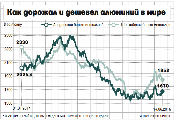 Цена и производство алюминия в Китае влияют на мировые цены – при увеличении экспорта из КНР цены на алюминий падают, напоминает Худалов, соответственно, UC Rusal теряет в выручке. Китай стал нетто-экспортером в 2013 г., тогда КНР впервые начала поставлять алюминий на внешний рынок – 231 000 т, а к 2015 г. экспорт вырос до 1,7 млн т, подсчитала Алюминиевая ассоциация. Это произошло одновременно с введением новой складской политики Лондонской биржи металлов (LME), которая предполагала растоваривание складов. С марта 2015 г. по июнь 2016 г. запасы алюминия на складах биржи сократились почти в 2 раза до 2,5 млн т. Это привело к падению цен на алюминий с начала 2015 г. на 17% до $1581 за 1 т ($1670 за 1 т с учетом премии к цене в порту Роттердам).