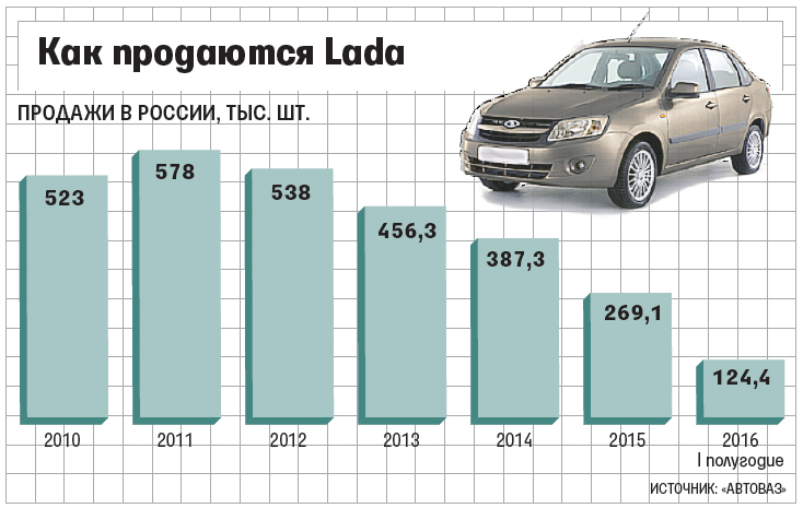 Второе значимое изменение коснулось размера бонуса при выкупе автомобилей. До июля при предоплате дилеры «АвтоВАЗа» могли получить 2%-ную скидку от рекомендованной розничной цены (за исключением новинок – Lada Vesta и Lada Xray), а теперь лишь 1%, рассказывают собеседники «Ведомостей». «Раньше мы выкупали все автомобили Lada, теперь думаем, по каким моделям имеет смысл это продолжать», – говорит один из дилеров. Скорее всего, это будут только модели с высокой оборачиваемостью – например, Lada Largus и Lada 4x4, размышляет он. Другой дилер до 1 июля тоже покупал все Lada по предоплате и теперь хочет минимизировать использование этой схемы. Под выкуп дилеры зачастую привлекают кредиты, по массовым моделям выгода есть и при 1%-ной скидке, получаемой от «АвтоВАЗа» при предоплате, но рынок и продажи Lada продолжают сокращаться (см. график) и машины могут «застояться», объясняет он. В первом полугодии 2016 г. по сравнению с аналогичным периодом прошлого года продажи легковых и легких коммерческих автомобилей в России упали на 14,1%, Lada – на 12%, гласят данные АЕБ. «АвтоВАЗ», видимо, хочет сэкономить на выплатах дилерам, ведь ему сейчас особенно нужны деньги, отмечает один из них. По итогам 2015 г. компания получила рекордный убыток – почти 74 млрд руб. по МСФО, у нее отрицательный свободный денежный поток.