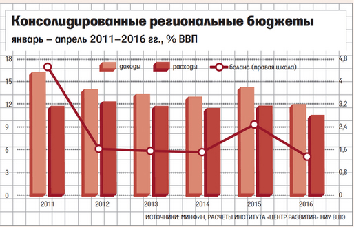 Из-за сокращения доходов все больше регионов сводят баланс с дефицитом уже в начале года, отмечает Чернявский. Профицитных регионов все меньше, беспокоится Счетная палата: в 2011 г. было 57 дефицитных и 26 профицитных, а 1 января 2016 г. – 76 и 9 соответственно. Суммарный профицит формируется в основном за счет нескольких регионов, получающих столичную или природную ренту, указывает Чернявский, и, несмотря на политику ограничения расходов, 38 регионов в январе – апреле не смогли свести бюджет с профицитом (в прошлом году таких регионов было 28).
