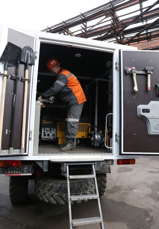 Машина оснащена специальным оборудованием для производства сварочных работ, гидравлической помпой для откачки воды, компрессором для продувки коротких частей трубопроводов и подачи воздуха в труднодоступные места, переносным гидравлическим прессом, сверлильным станком, болгаркой. Конструкция позволяет подключить необходимые для ремонта агрегаты. Теперь большую часть ремонтов специалисты проводят на месте поломки, что значительно сокращает время и улучшает качество работ.