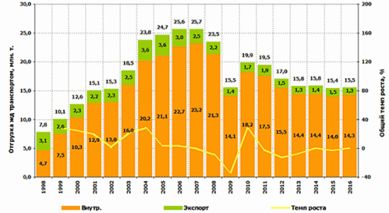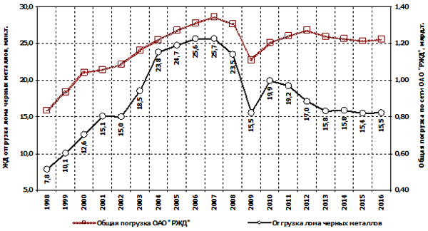 Рисунок 3- Структура и динамика отгрузок лома черных металлов железнодорожным транспортом за период 1998-2016 гг.