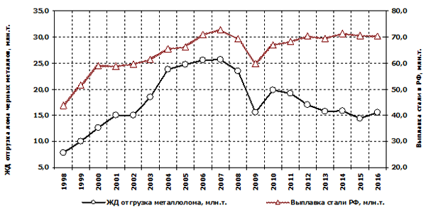 Ожидается, что по итогам 2016 г. выплавка жидкой стали на предприятиях РФ составит 70,4 млн.т., уменьшившись в сравнении с прошлым годом на -1,2 млн.т. или на -0,3 %. Следует отметить, что погрузка черных металлов железнодорожным транспортом, за этот же период, уменьшилась на -0,4 млн.т. или -0,5 % до 71,0 млн.т., при увеличении отгрузки лома черных металлов на +0,1 млн.т. или +0,6% до 15,5 млн.т., руды железной и марганцевой на +0,5 млн.т. или +0,5 % до 109,5 млн.т.