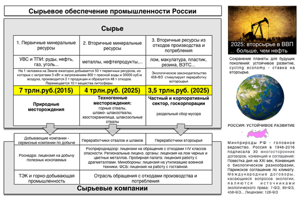 Идет противостояние двух точек зрения – сжигать отходы или перерабатывать, вовлекая вторсырье в хозяйственный оборот. Расчеты показывают, при интенсивном развитии отрасли обращения с отходами, вклад вторсырья в ВВП России превысит доходы от добычи твердых полезных ископаемых уже в 2025 году. При этом, необходимо рассматривать комплексный и системный подход к сырьевому обеспечению российской промышленности: первичные минеральные ресурсы, вторичные минеральные ресурсы (техногенные отходы), вторичные ресурсы из отходов производства и потребления. По опыту западных стран принципиальное значение имеет поддержка отрасли со стороны государства в виде последовательного введения законов, стимулирующих перерабоку и потребление вторсырья в России, а также специальных программ государственного закупа продукции из вторсырья “Зеленые закупки”.