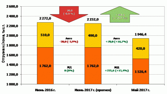 Ожидается, что в июне 2017 г. отгрузка лома черных металлов с территории РФ, в сравнении с маем 017 г. покажет увеличение на +305,6 тыс.т. или +15,7% до уровня 2252,0 тыс.т., но не достигнет уровня 2016 г. в 2272,0 тыс.т. Прогнозируется, что отгрузка железнодорожным транспортом, в сравнении предыдущем месяцем, увеличится на +235,6 тыс.т. (+15,4%) до 1762,0 тыс.т. что соответствует уровню жд отгрузки прошлого года. Автомобильным транспортом, в адрес металлургических предприятий может быть отгружено порядка 490,0 тыс.т. лома черных металлов, что на +70,0 тыс.т. (+16,7%) больше чем в мае текущего года, но на -20,0 тыс.т. (-3,9%) меньше июньских поставок прошлого года.