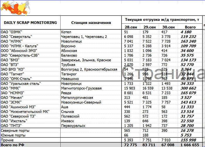 Внутренние перевозки. В мае 2017 г. во внутригосударственном направлении было отгружено 1404,7 тыс.т. лома черных металлов, что на +223,7 тыс.т. или +18,9 % больше показателей апреля 2017 г. Относительно аналогичного периода прошлого года произошло снижение внутригосударственных перевозок металлолома на -70,9 тыс.т. или -4,8%. В таблице приведена данные об отгрузке металлолома с территории РФ (без учета отгрузки из других стран) в адрес некоторых крупнейших отечественных предприятий.