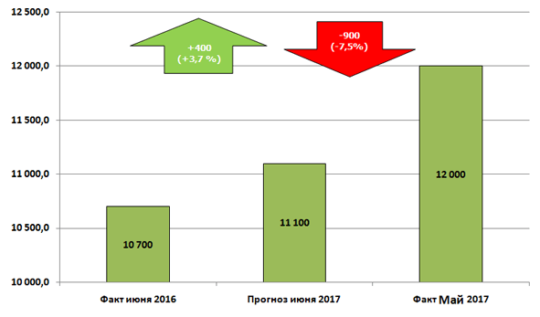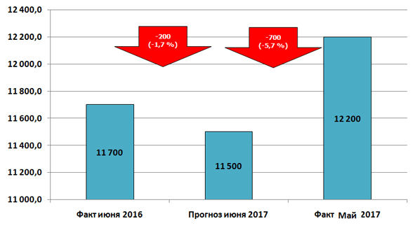 Ожидается, что в июне 2017 г. среднерыночная закупочная цена, на фоне увеличения предложения от первичных ломосдатчиков, продолжит снижение. Прогнозируется, что для предприятий Европейского региона среднерыночная закупочная цена будет находится на уровне 11,5 тыс.руб., что на -700 руб. или -5,7% меньше уровня предыдущего месяца, и на -200 руб. или -1,7% меньше показателей прошлого года. В Уральском регионе ожидается снижение цен до 11,1тыс. руб., что на -900 руб. или -7,5% меньше уровня апреля, но на +400 руб. или +3,7% больше значений прошлого года.