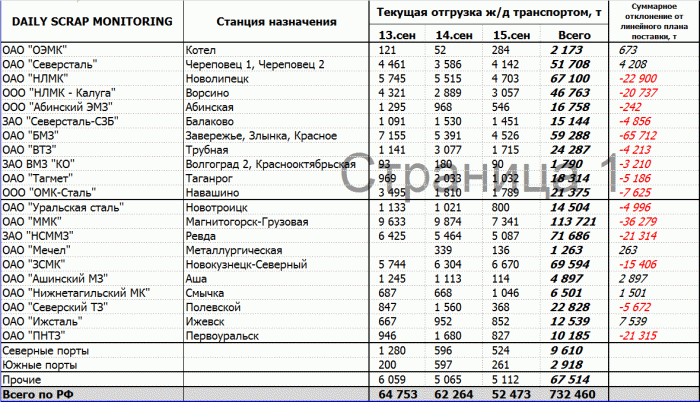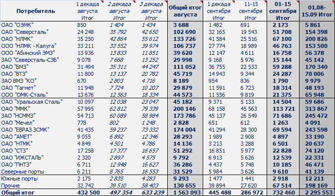 Динамика отгрузки лома черных металлов жд транспортом в адрес крупнейших потребителей за период 01 августа-15 сентября