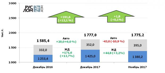 В ноябре 2017 г. отгрузка лома черных металлов железнодорожным и автомобильным транспортом, относительно предыдущего месяца уменьшилась на -297 тыс.и. или -14,3%, но увеличилась относительно ноября прошлого года на +178,9 тыс.т. (+11,2%) до 1 775,2 тыс.т.