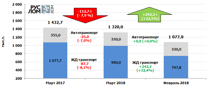 Согласно оперативным данным ГВЦ ОАО «РЖД» по состоянию на 1 апреля 2018 г. в марте текущего года отгрузка по сети железных дорог по номенклатуре лом черных металлов составила 1071,4 тыс. т., что на +259,3 тыс. т. (+31,9%) больше значений предыдущего месяца и меньше на -53,6 тыс. т. (-4,8%) показателей за аналогичный период прошлого года.
