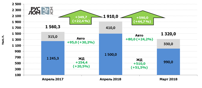 Во внутригосударственном направлении отгрузка по сети железных дорог по номенклатуре лом черных металлов 949,1 тыс. т., что на +233,0 тыс. т. (+32,5%) больше показателей предыдущего месяца и на -78,4 тыс. т. (-7,6%) меньше значений марта 2017 г.
