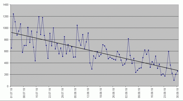 Так выглядит график заготовки лома по дням у одного из лидеров рынка России, который осуществляет поставки как на внешний, так и внутренний рынок. Динамика стабильно отрицательная.