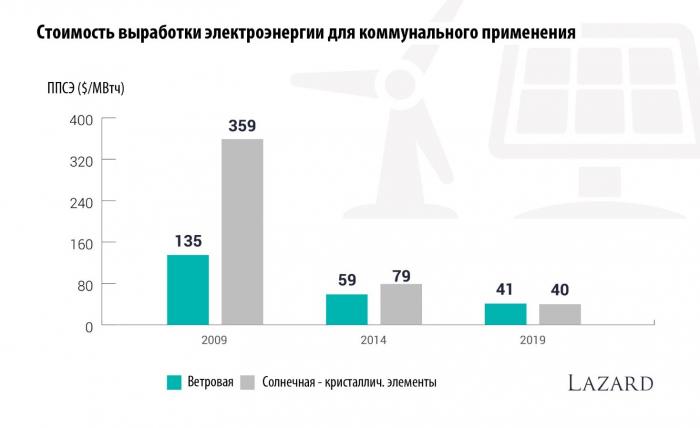 Компания LAZARD в ноябре 2019 г сопоставила нормированную стоимость электроэнергии (LCOE - среднюю расчётную себестоимость производства электроэнергии на протяжении всего жизненного цикла электростанции), полученной различными способами (в исследований собраны данные по США, Австралии, Бразилии, Индии, Южной Африке, Японии и Европе):